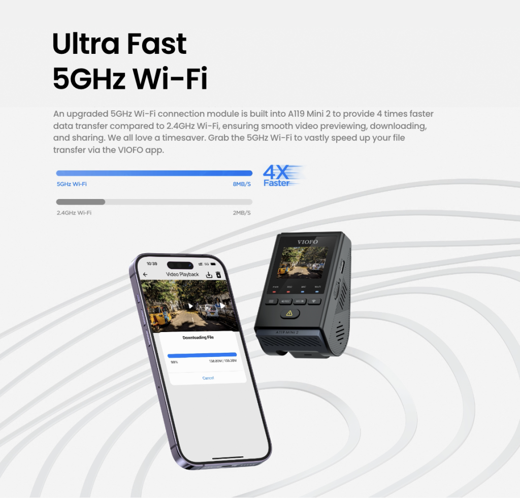 You can connect your smartphone to your dash cam via Wi-Fi and download camera files. The Viofo A229 Pro, A229 Plus, A139 Pro, A119 Mini 2 all offer 5GHz Wi-Fi for quicker download speeds of video files. With real-time previews and quicker transfer speed, this setting is hard to beat.